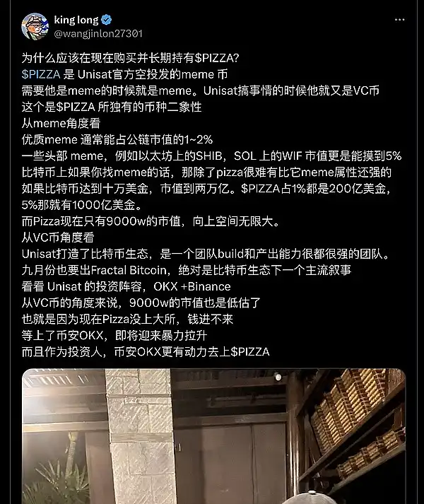 ● BTC 生态投资人 @wangjinlon27301 表示,$PIZZA 是 Unisat 官方 meme 币,具备 meme 和 VC 双重属性。凭借强大的团队支持和即将推出的 Fractal Bitcoin,市值潜力巨大。
