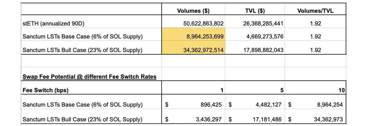· 交互量模型:虽然 LSTs 的交互量难以精确建模,但我们可以从 Lido 的 stETH 中得到一些启示。stETH 的年化 90 天链上交易量为 506 亿美元,约为其当前 TVL 的 1.9 倍。以此比率为参考,Sanctum 在基本情境下的年化交易量可能约为 90 亿美元,而在牛市情境下则可能达到约 340 亿美元。接下来,可以通过假设 Sanctum 的产品在 LST-to-SOL 或 LST-to-LST 交互中收取 1、5 或 10 个基点的交互费,来估算协议可能获得的潜在交互费用。