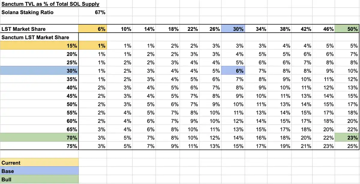 · TVL 模型:如果 Solana 上的 LST 市场份额达到以太坊的水平,并且 Sanctum LSTs 的市场份额达到 Lido 的水平,Sanctum 的 TVL 可能从目前占 SOL 供应量的 1% 扩大至 6%,即增长 6 倍。如果 V2 的个性化 LSTs 作为社交和忠诚度层的概念获得更多认可,潜在的增值空间可能会更大。