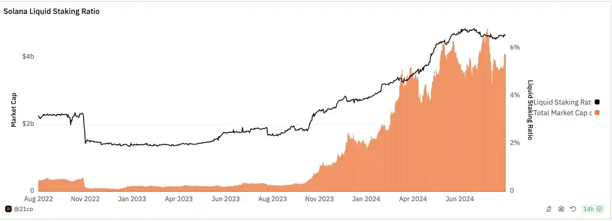 Solana 上的流动性质押代币(LSTs)一直以来都不如在 Ethereum 上成功。例如,Lido 曾尝试在 Solana 上扩展,但由于缺乏用户吸引力,于 2023 年 10 月退出。Ethereum 上的 LSTs 市场份额较高,占所有 ETH 质押量的 32%。而 Ethereum 的质押比例约为 28%,因此 LSTs 占 ETH 总市值的不到 10%。相比之下,Solana 的质押比例更高,达到 67%,但 LSTs 仅占约 6% 的市场份额,约占 SOL 总市值的 4% 多一点。