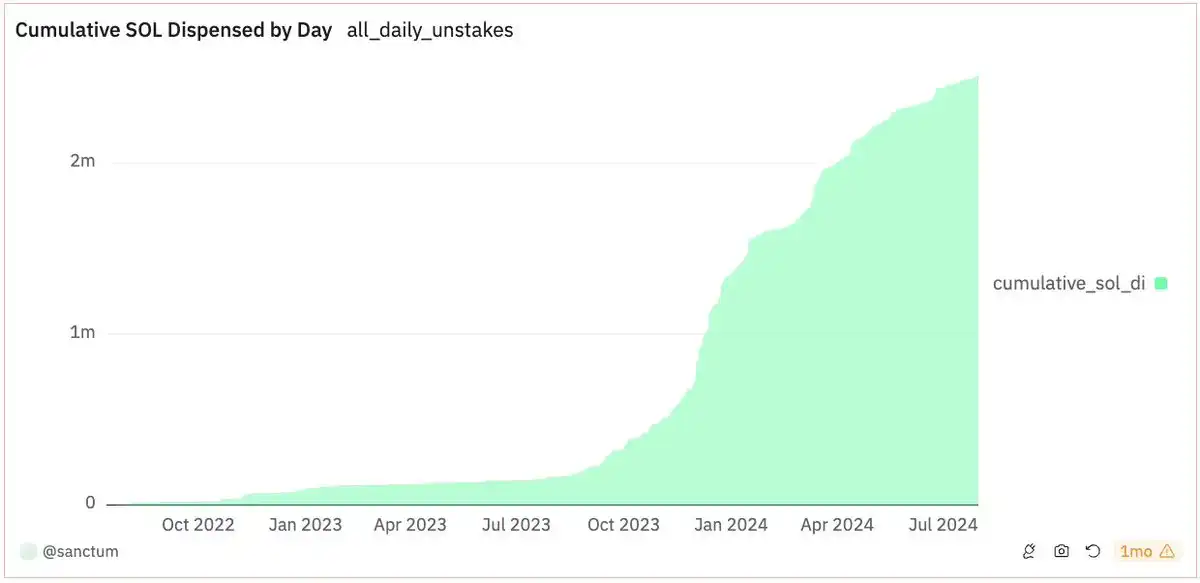 · 储备池:这是一个闲置的约 40 万 SOL 的资金池,允许用户以小额费用即时将 LST 兑换为 SOL,从而绕过一个历元的等待期。这为 DeFi 协议提供了一个安全网,使其能够将任何 LST(无论大小)作为抵押品进行集成。自 2022 年 7 月以来,通过储备池取消抵押的 SOL 总量为 250 万,平均每日使用率不到 1%。