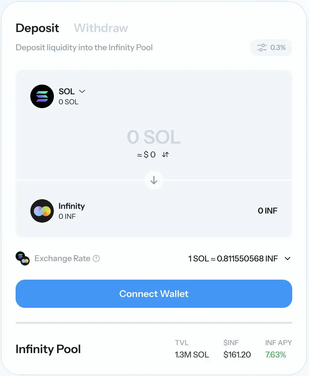 · Infinity 是一个由 Sanctum 批准的 LSTs 组成的流动性池,允许在池中任何包含的 Token 之间进行交互。流动性提供者可以将 LSTs 存入池中,以换取 INF Token。INF Token 本身也是一个 LST,这意味着它可以与 DeFi 组合使用,并且能够累积基础 LSTs 的质押奖励和池中的交易费用。目前,INF 的年化收益率(APY)为 7.63%,略高于 JitoSOL 的 7.59% 和估计的全网年化收益率 7.34%。