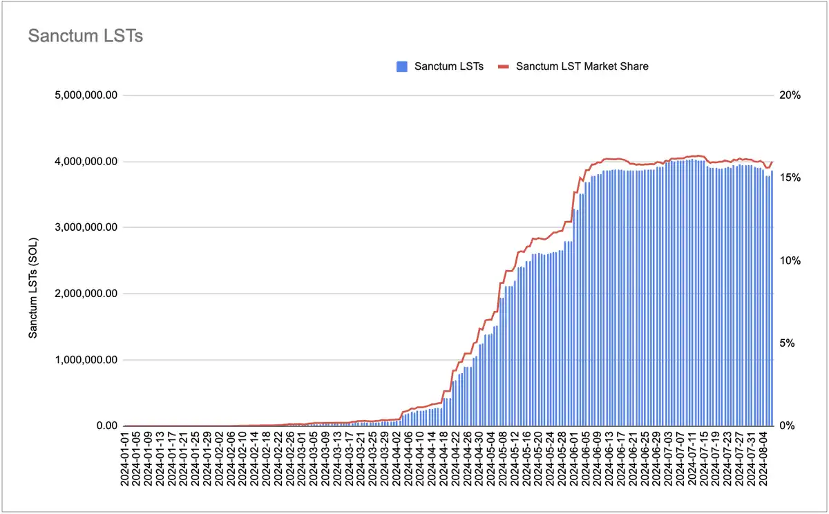 · 上述图表中不易直接看出的是,Sanctum 自 2024 年第一季度协议启动以来,LSTs 的市场份额已从 0 增长至超过 16%。Sanctum 是一个流动性质押协议,能够支持 LSTs 的创建、交易和管理。