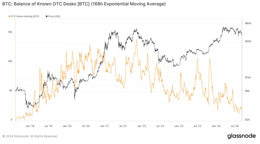 数据表示与场外交易(OTC)柜台相关的地址中存储的加密货币的累积余额。可能在场外需求量突然上升时,会使得场内 OTC 商家增加 BTC 的存储,变相地促进了场内的需求量紧缺。