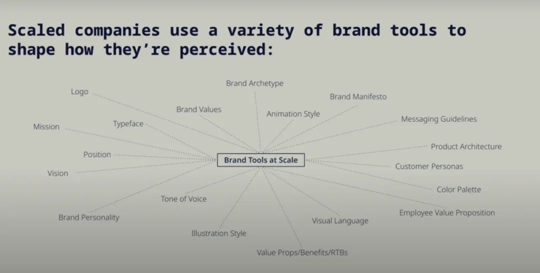 当你成为一家规模较大的公司时,你可以使用很多工具来管理品牌。这些工具包括视觉或语言等方式,帮助我们在市场中一致地传递关于我们是谁、以及我们希望被认为什么的信息。