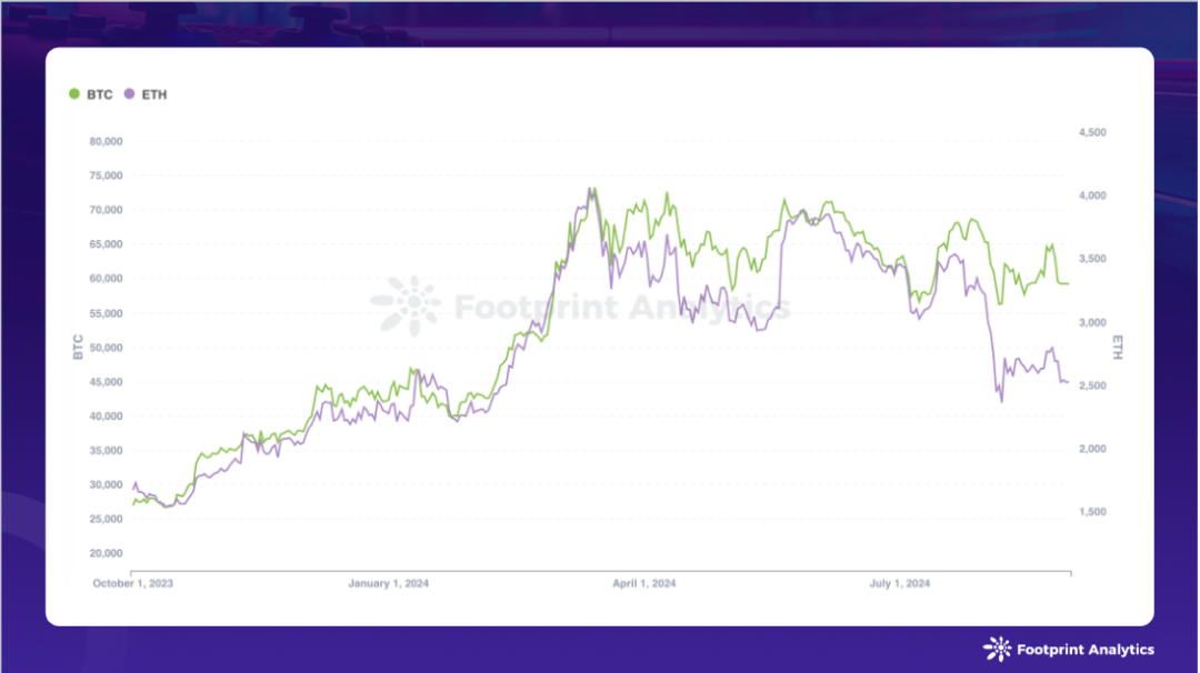 8 月份,比特币和以太坊均出现了显著的下跌。比特币月初价格为 65,290 美元,月末则收于 59,246 美元,跌幅达 9.3%。以太坊的下跌趋势更为明显,从 3,220 美元跌至 2,531 美元,跌幅高达 21.4%。