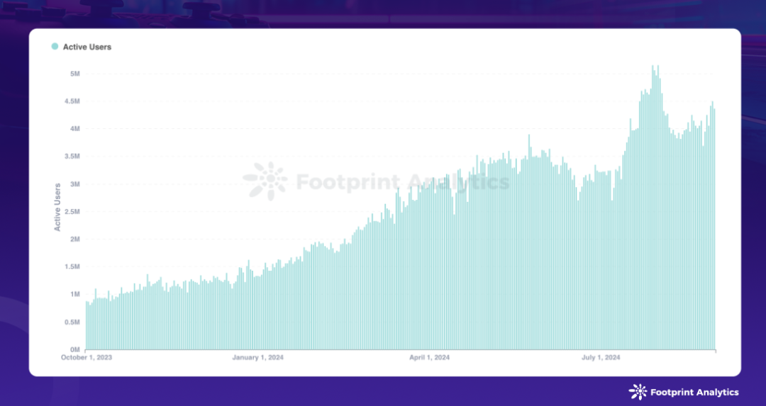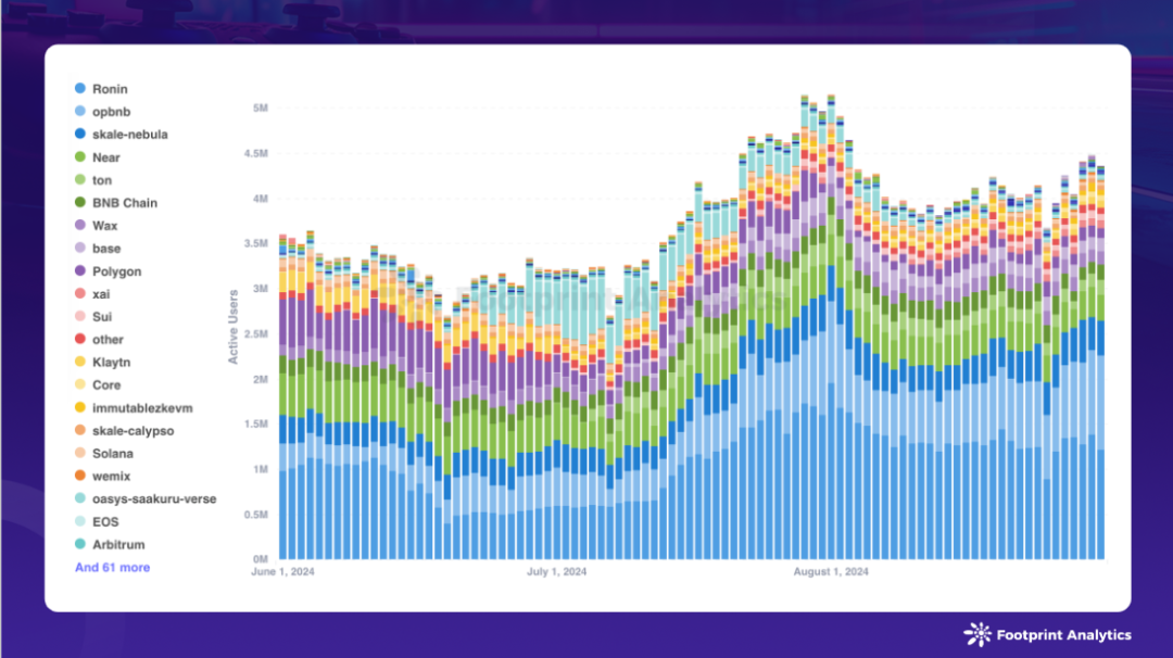 尽管市场出现下滑,8 月份 Web3 游戏的每日活跃用户(DAUs,以独立钱包 / 地址计算),达到了 415 万,较 7 月增长了 6.88%。这一增长主要得益于 Ronin 和 opBNB 上的活跃度。