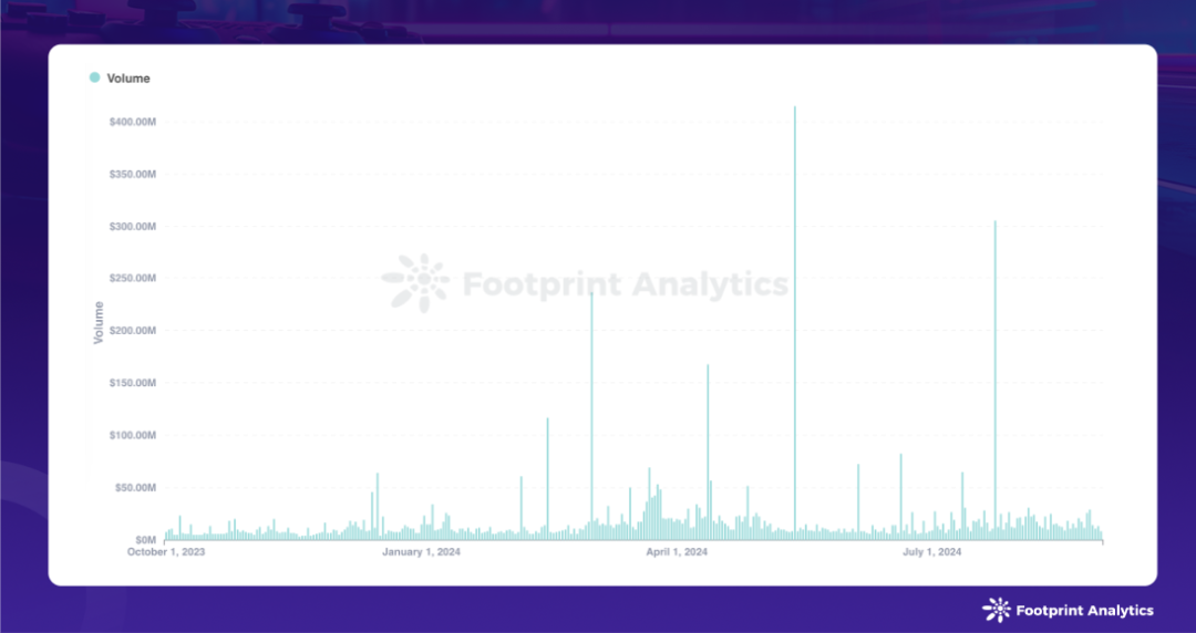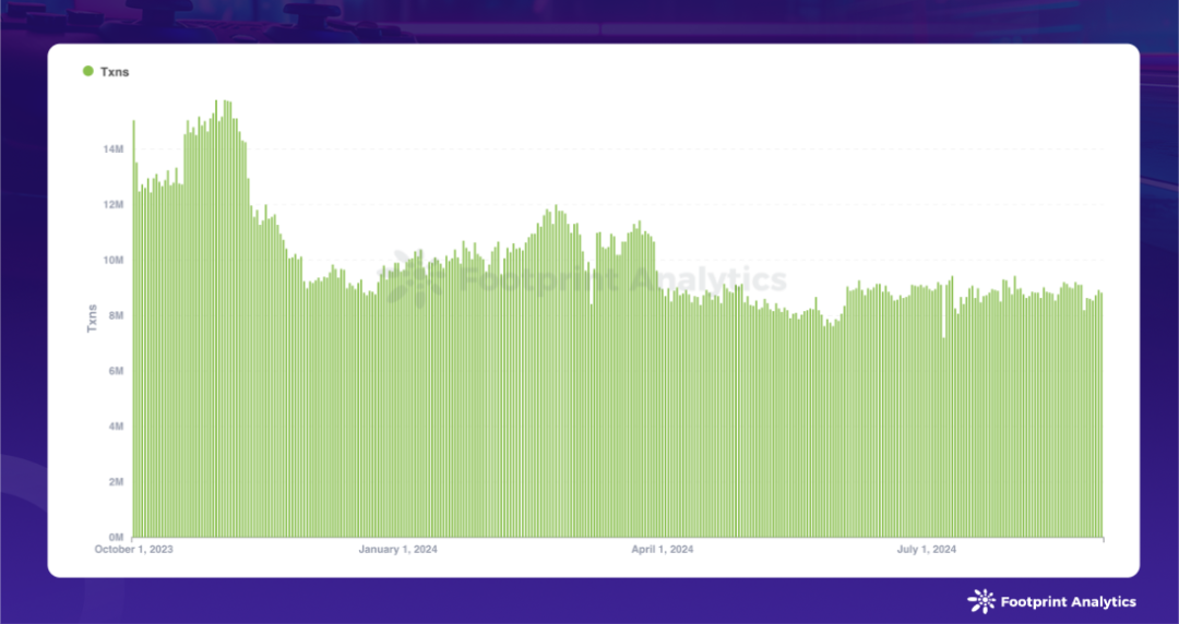 区块链游戏的平均每日交易量达到 886 万笔,较 7 月轻微下降了 0.46%。一个值得注意的趋势是在如 Aptos 这样的链上交易笔数激增,主要由 Telegram 游戏如 Tapos 所驱动。由于游戏机制的原因,每次点击都会产生一笔交易(Transaction),导致 Aptos 上每日交易量在高峰期超过 5,000 万笔。目前,我们尚未将这一数据纳入统计范畴,因为我们打算在更长的时间跨度内观察这一趋势。