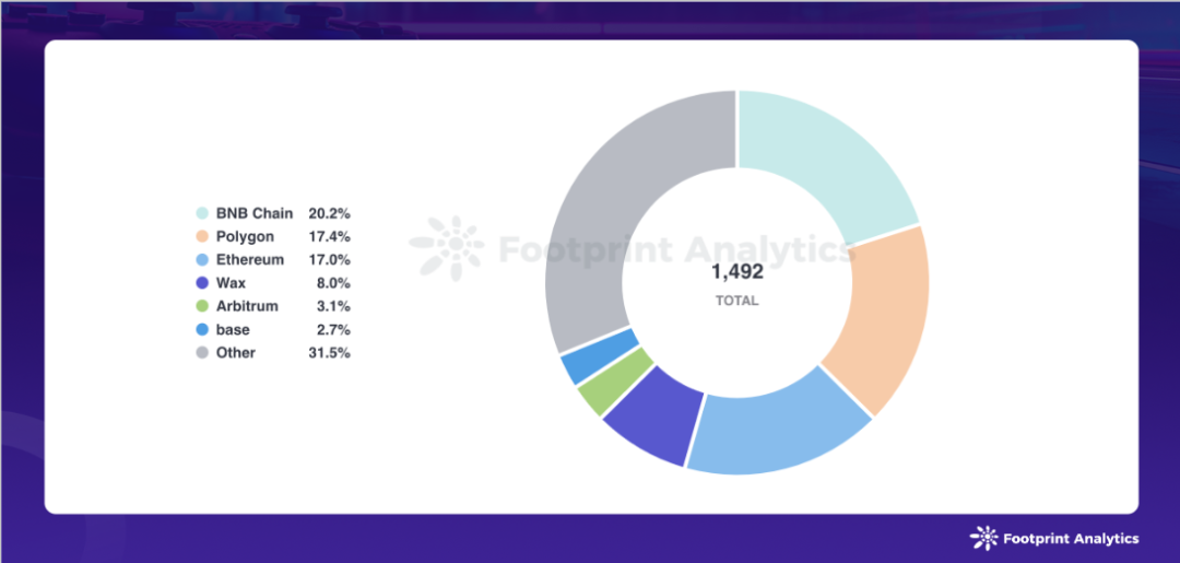 在 8 月份,共有 1,492 款游戏在各个区块链网络上活跃,较 7 月下降了 5.45%。BNB 链、Polygon 和 Ethereum 分别以 20.2%、17.4% 和 17.0% 的市场份额领跑市场。