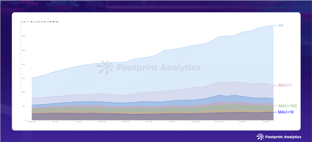 在 8 月份,区块链游戏生态系统共包含 3,401 款游戏,其中 1,254 款游戏处于活跃状态。在这 1,254 款活跃游戏中,有 290 款游戏吸引了超过 1,000 名每月活跃链上用户(MAU),这占到了总游戏数量的 8.5%,以及活跃游戏数量的 23.1%。