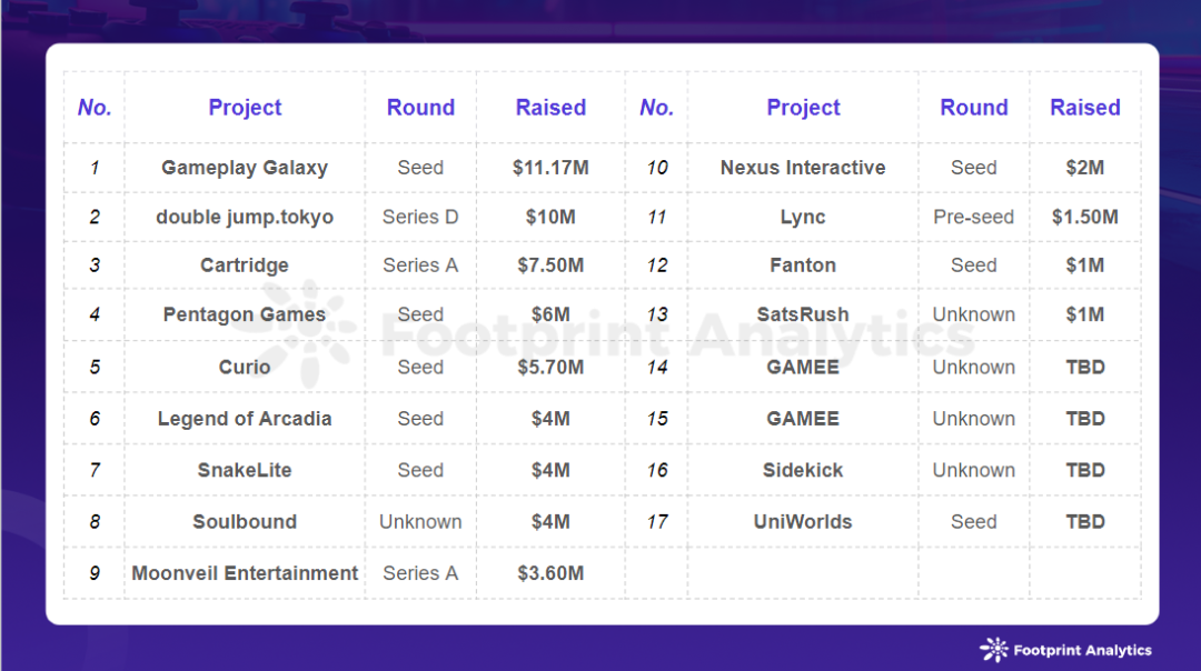Animoca Brands 在 8 月的 17 起融资事件中,主导或参与了 6 起,这表明他们尽管面临宏观经济波动,仍在坚定不移地推动 Web3 游戏行业的发展。