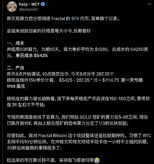挖矿 $FB 成本计算实例,产出感人。租用了 50P 的算力来挖 Fractal 网络的 $FB 代币,租期为 10 天,总成本约为 54,250 美元,第一天亏损 1,114 美元。如算力保持或增长,FB 至少 31u 才不亏钱。但计划持币观望。by @easymct