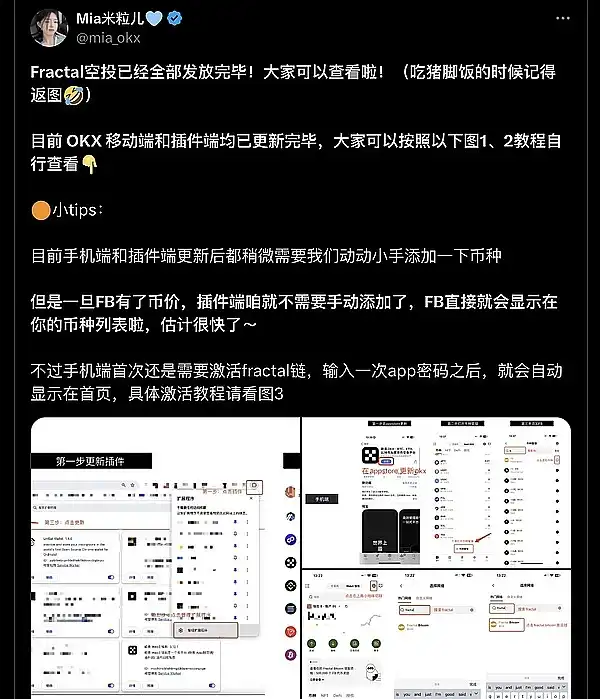 ● Fractal @fractal_bitcoin 主网启动计划代币奖励已全部分发完毕!OKX 方面可升级 App 至 V6.84.0 版本,进入钱包首页,通过币种管理搜索并添加 "FB" 即可查看代币。钱包中的 $FB 已经显示价格了!快去查看你的钱包吧!by @mia_okx