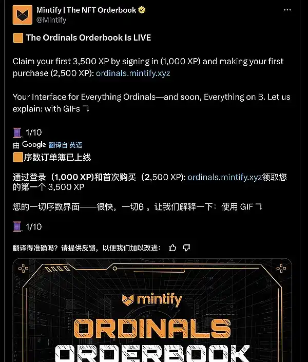 ● Ordinals 交易平台 @Mintify 订单簿已上线,通过登录(1,000 XP) 和首次购买(2,500 XP): 目前可使用 @xverse 登陆,ordinals/mintify/xyz 领取您的第一个 3,500 XP。积分将在未来可兑换平台 Token。