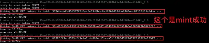 ⑤ 再次输入 `bash ~/cat20-oooooyoung.sh` 进入脚本界面,输入 3 进行 $CAT 代币的循环 mint,因为打的人多可能会 mint 失败导致重试,一直挂机即可