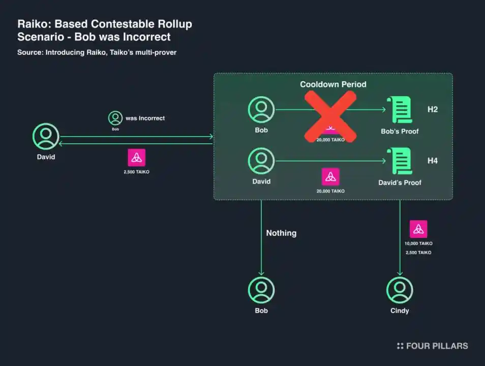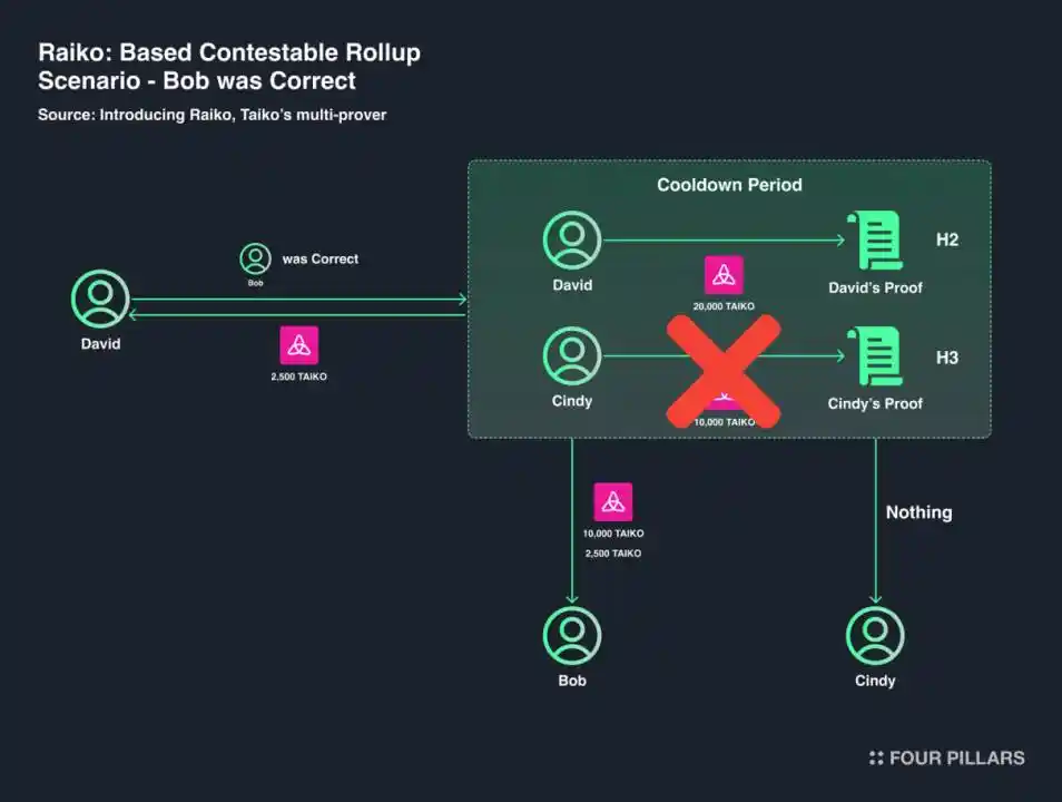 David 提供了一个从 H1 → H4 的三步转换证明,证明 Bob 的转换是错误的。David 因此获得 2,500 TAIKO 作为奖励,并质押 20,000 TAIKO 作为押金,为他的修改状态信息和证明提供资本支持。