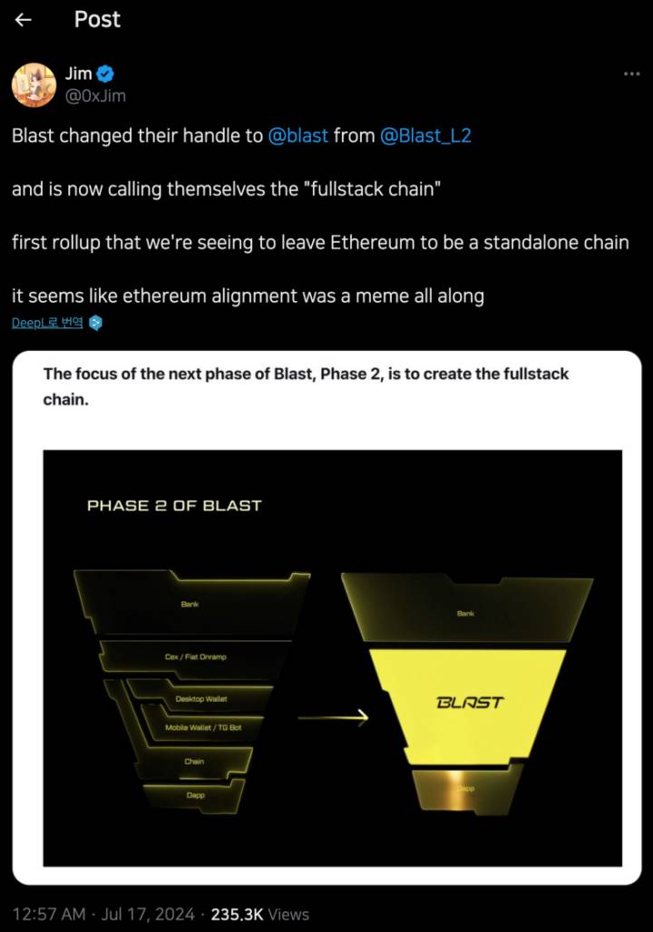 例如,Blast 于 2024 年 2 月 29 日上线其主网,最初强调其作为以太坊 L2 的定位和理念。然而,某个时候,它开始自称为「全栈链」,逐渐与以太坊保持距离。Blast 在 X(前身为 Twitter)上的官方账号从 @Blast_L2 改为 @blast,这并非偶然。