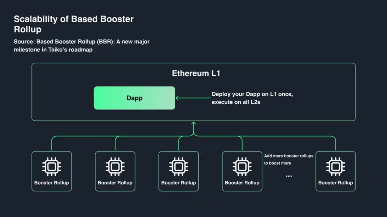 BBR 是从开发者角度扩展 Based Rollup 优势的一种延伸,探讨了如何将 Based Rollup 的优势应用于区块链核心基础设施的应用层。通过 Taiko 的 BBR,开发者只需在 L1 以太坊上部署一次他们的 dApp,即可实现所有 L2 上的自动 dApp 部署,无需额外的工作或资源投入。