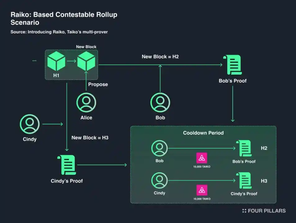 Cindy 认为 Bob 的状态变化应该是 H1 → H3,而不是 H1 → H2。Cindy 在冷静期内质押了她的 10,000 TAIKO 作为竞争性保证金,并对 Bob 的证明提出挑战。