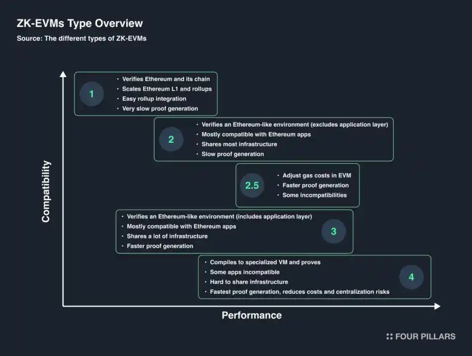 2022 年 8 月 4 日,Vitalik Buterin 发布了 The different types of ZK-EVMs,对 zkEVMs 进行了分析和分类。根据他的分析,zkEVMs 被分为 Type 1、2、2.5、3 和 4,数字越高意味着与以太坊的互操作性和兼容性越低,但在生成证明和整体性能上效率更高。换句话说,数字越高的 zkEVM 类型涉及的更改包括修改 EVM 核心或引入额外模块以优化性能。