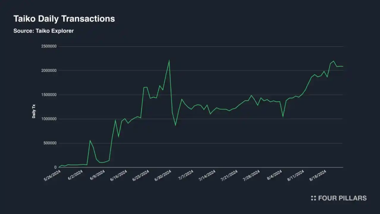 Taiko 的主网在网络活动方面取得了增长,实现了超过 1 亿笔交易。这种活动激增进一步体现在网络每天处理多达 2,000,000 笔交易,体现了其强大的容量和日益增长的采用率。不断扩大的用户基础通过吸引超过 1,000,000 个独特钱包地址得以体现,反映了用户对 Taiko 生态系统的强烈兴趣和参与。
