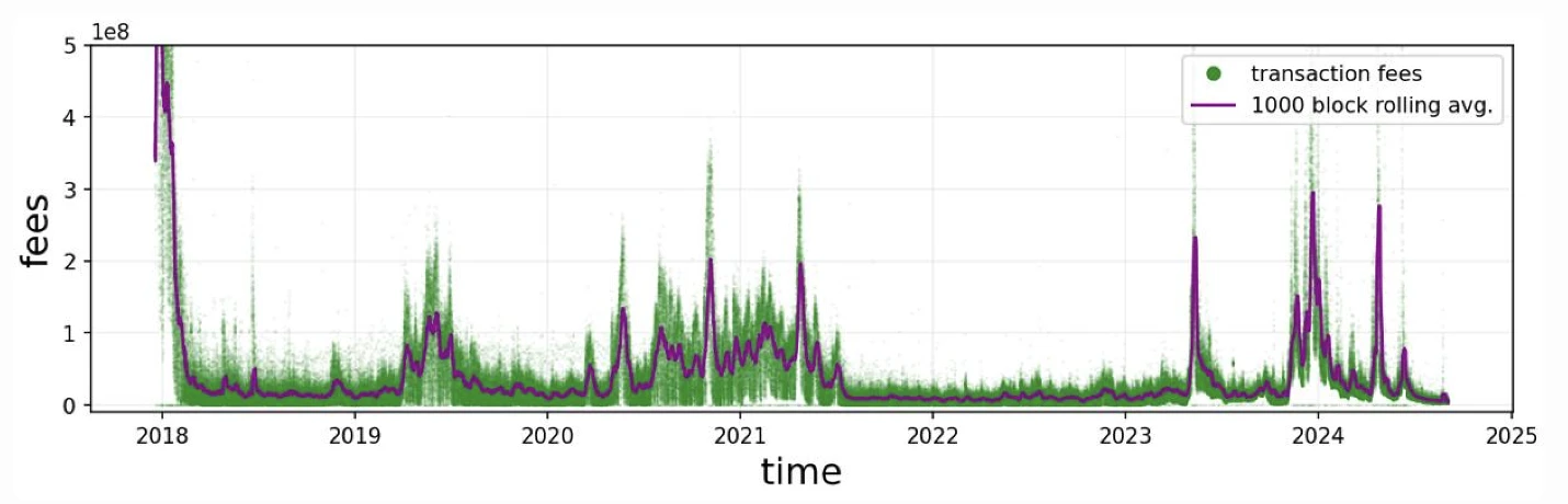 下图展示了过去六年比特币网络的手续费波动情况。我不相信在这样不稳定的收入流下,挖矿主体依旧能够保持盈利。以 2021 年中至 2023 年中的两年为例,比特币网络的手续费一直低于每个区块 1 BTC。更乐观的一种假设情况,大部分 BTC 都将被 ETF 发行方持有,他们可能会选择补贴挖矿行为,并通过资产管理业务模式继续赚取费用,但这显然并不是密码朋克精神所期待的结果。此外,认为费用收入将激励挖矿的观点似乎与「买入并持有(buy & hodl)」的主流观念相冲突。如果每个人都只是持有,那么费用从何而来?