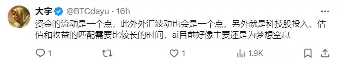 加密 KOL 大宇观点:资金的流动是一个点,此外外汇波动也会是一个点,另外就是科技股投入、估值和收益的匹配需要比较长的时间,ai 目前好像主要还是为梦想窒息。
