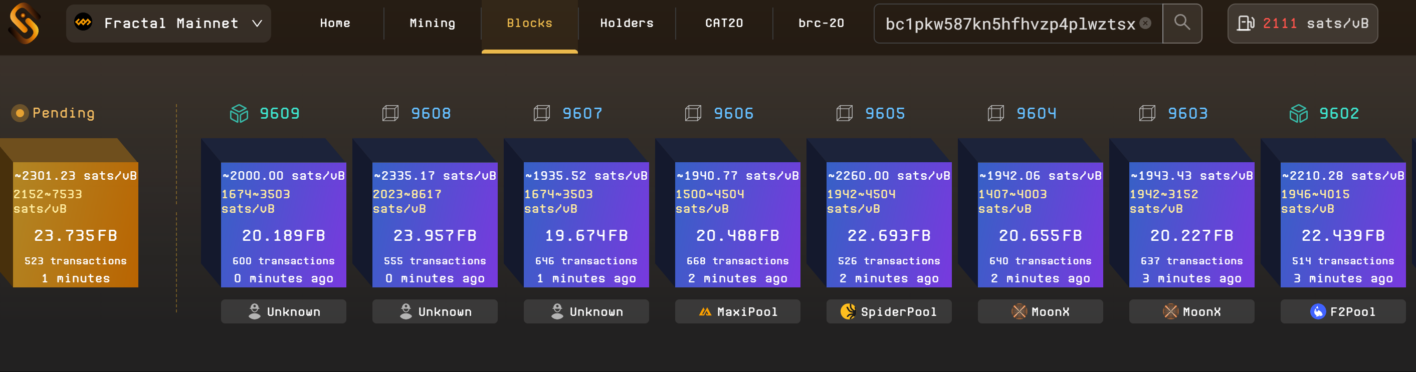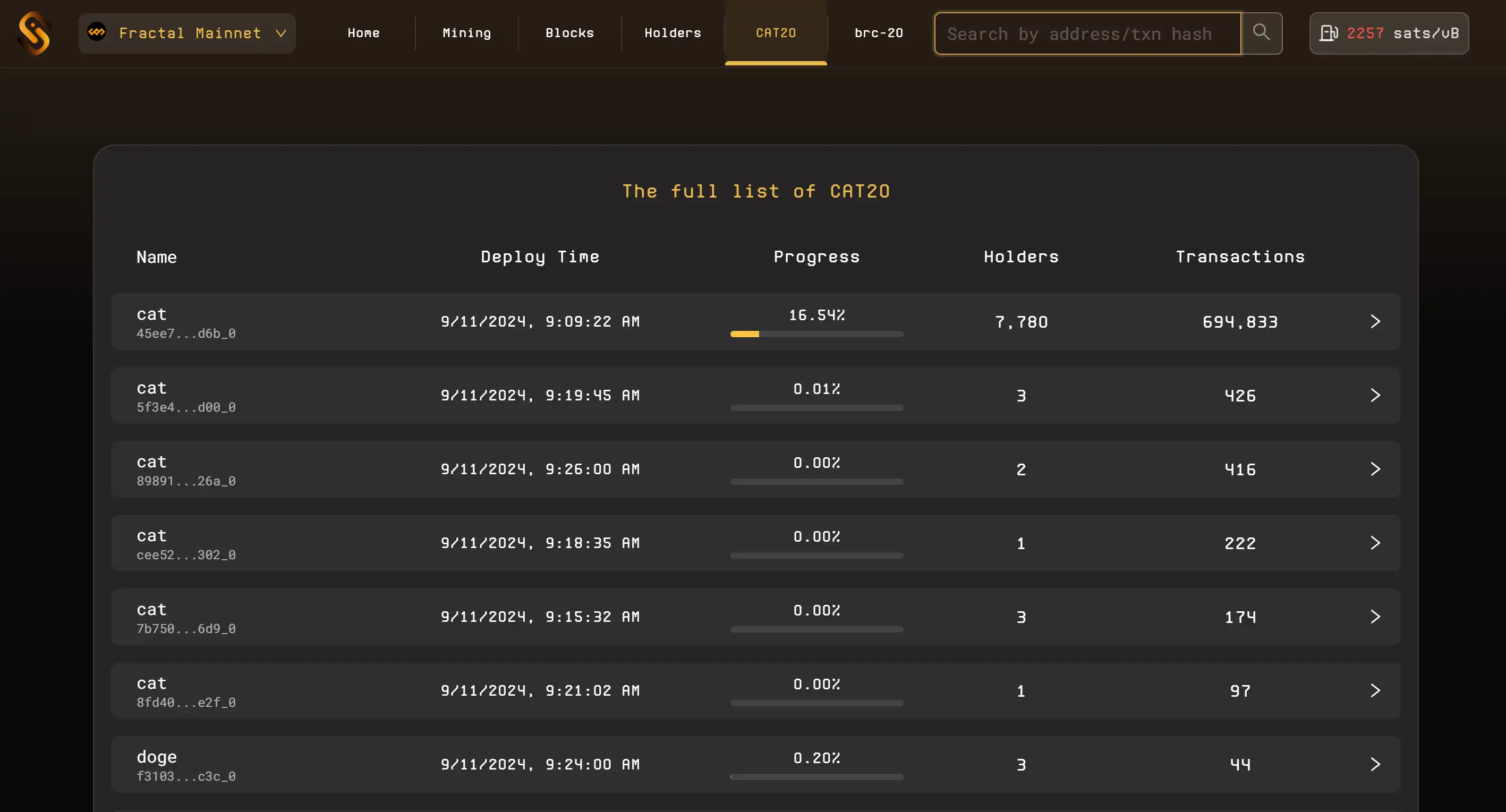 CAT20 在早期被玩家发现并形成传播以后还没有那么的火,因为直到昨天晚上,我都还可以用 300-500 sats/vb 的费率打到一些。真正爆火还是因为到昨晚快 11 点的时候,Fractal 的区块浏览器上突然多了个「CAT20」分栏,于是彻底 FOMO 起来了。