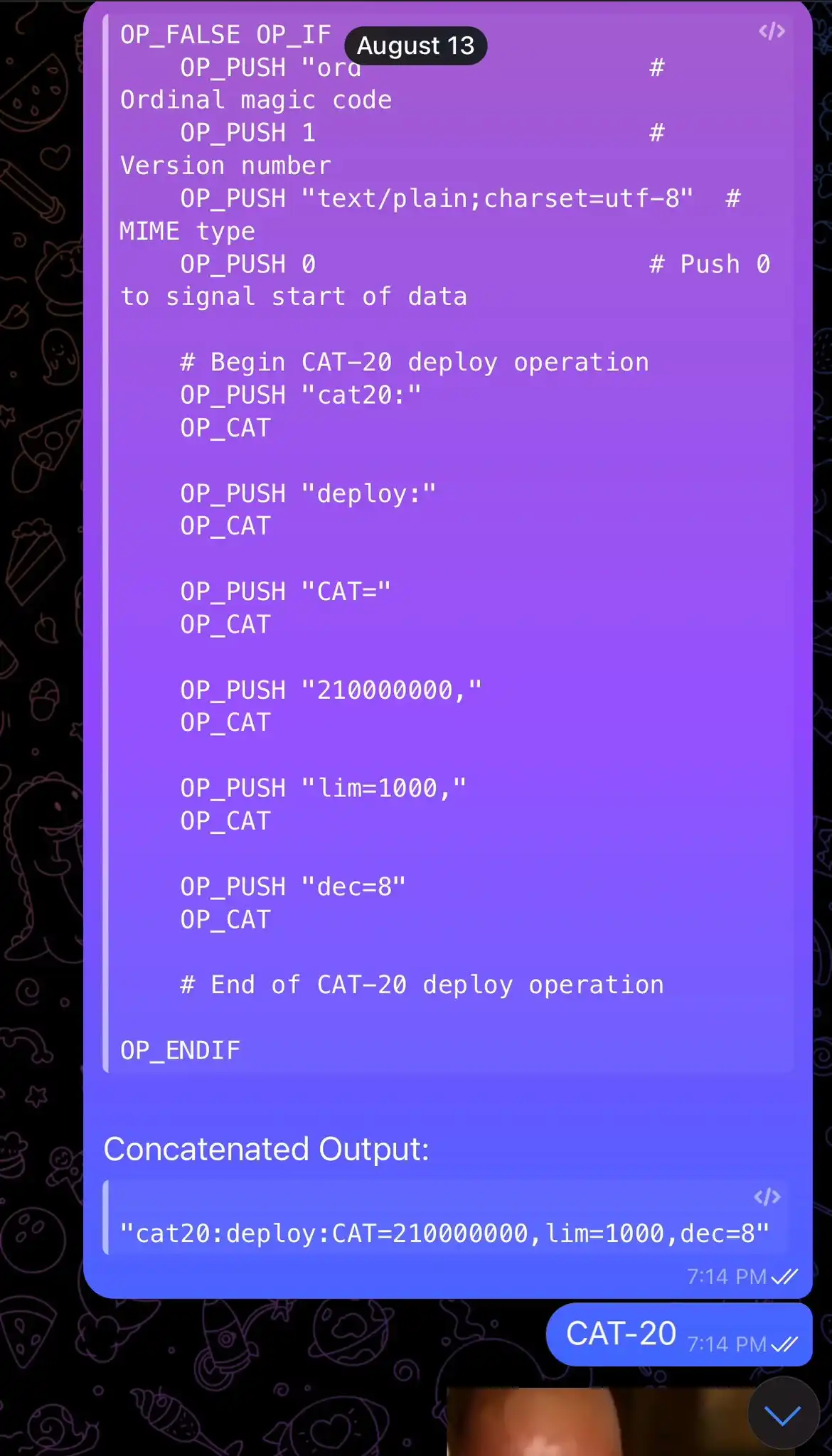 没有 CAT20 那样专业的技术文档,甚至也没有 CATNIP 那样详细阐述实现流程的推文,就只有这张 Telegram 截图。OK 没有关系,我给大家解释下这张图表达的思路——实际上就是用 OP_CAT 把 Mint 铭文的几个字段给串起来,OK,我发明了 OP_CAT 版本的 BRC-20 了。