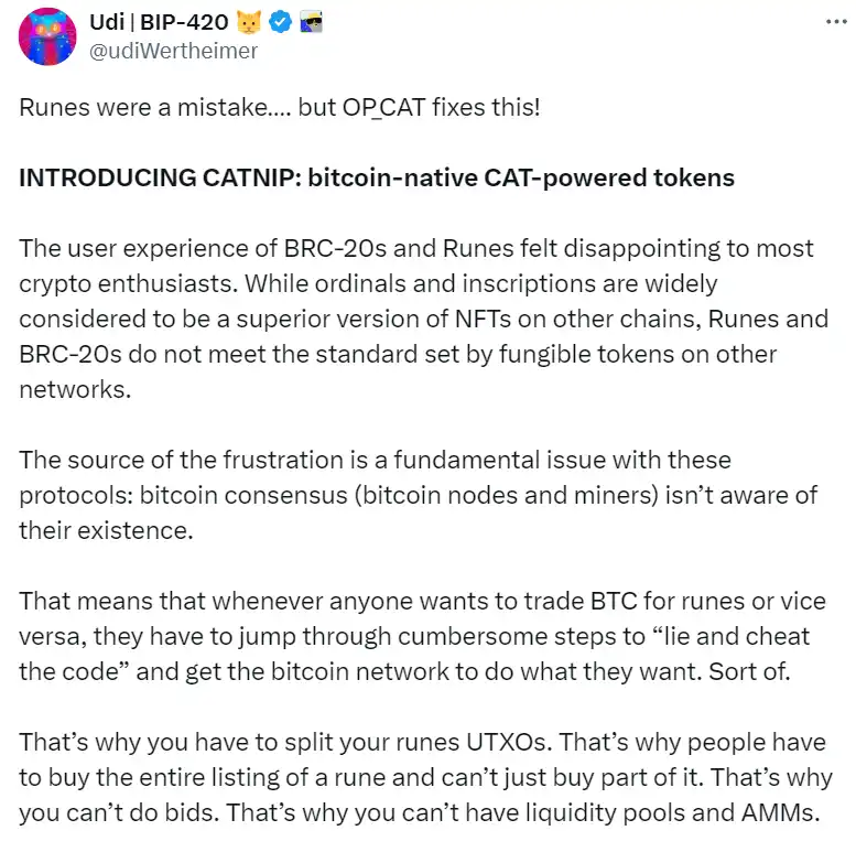 「量子猫」团队的 CATNIP 只是官宣,落地要等到比特币主网的 OP_CAT 复活。