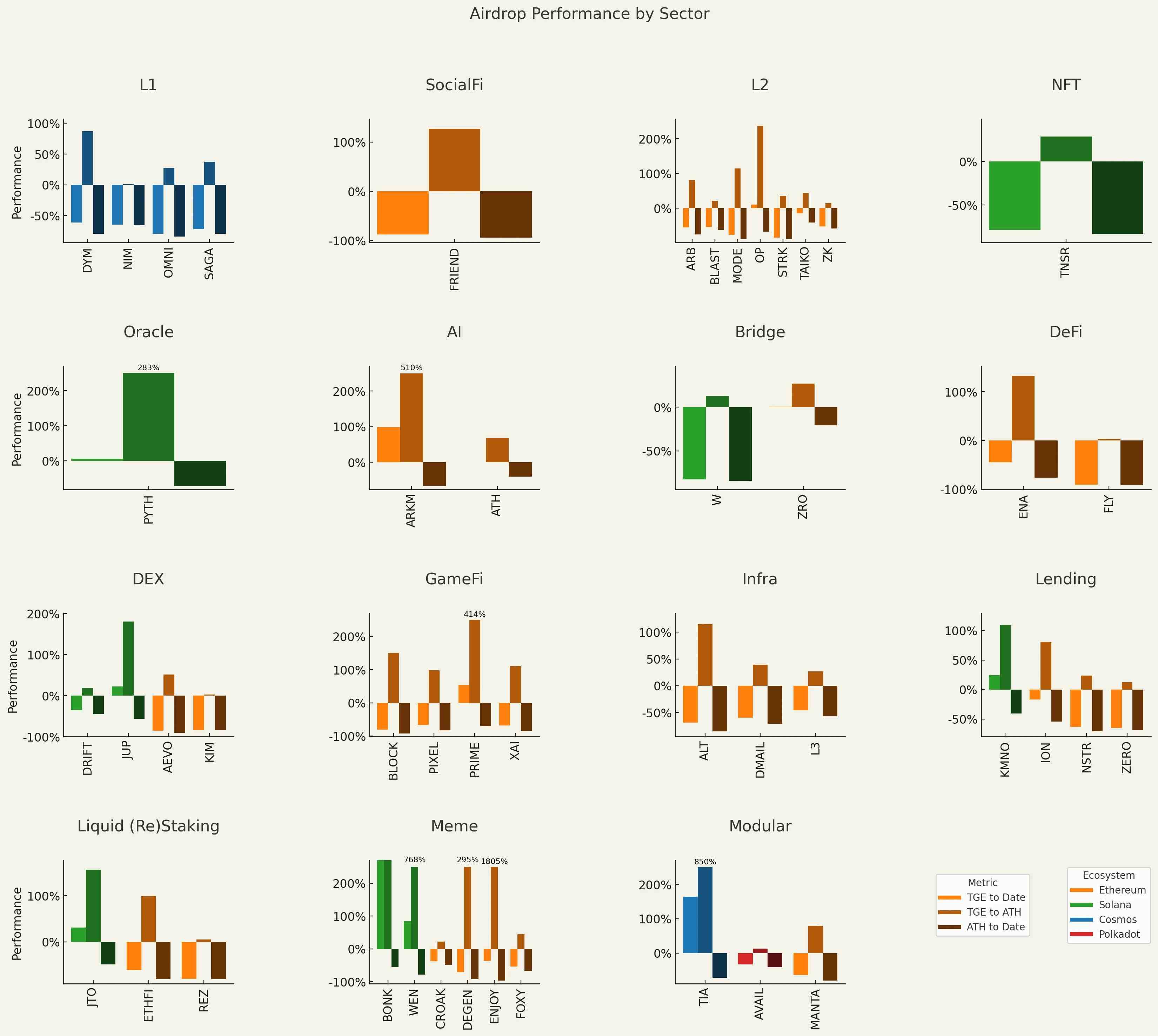 按生态系统分类来看,只有 Solana 的空投从 TGE 到目前为止是上涨的,这主要也是由于 BONK 的贡献,基于以太坊的空投表现最差,而基于 Cosmos 的空投则波动最为剧烈。