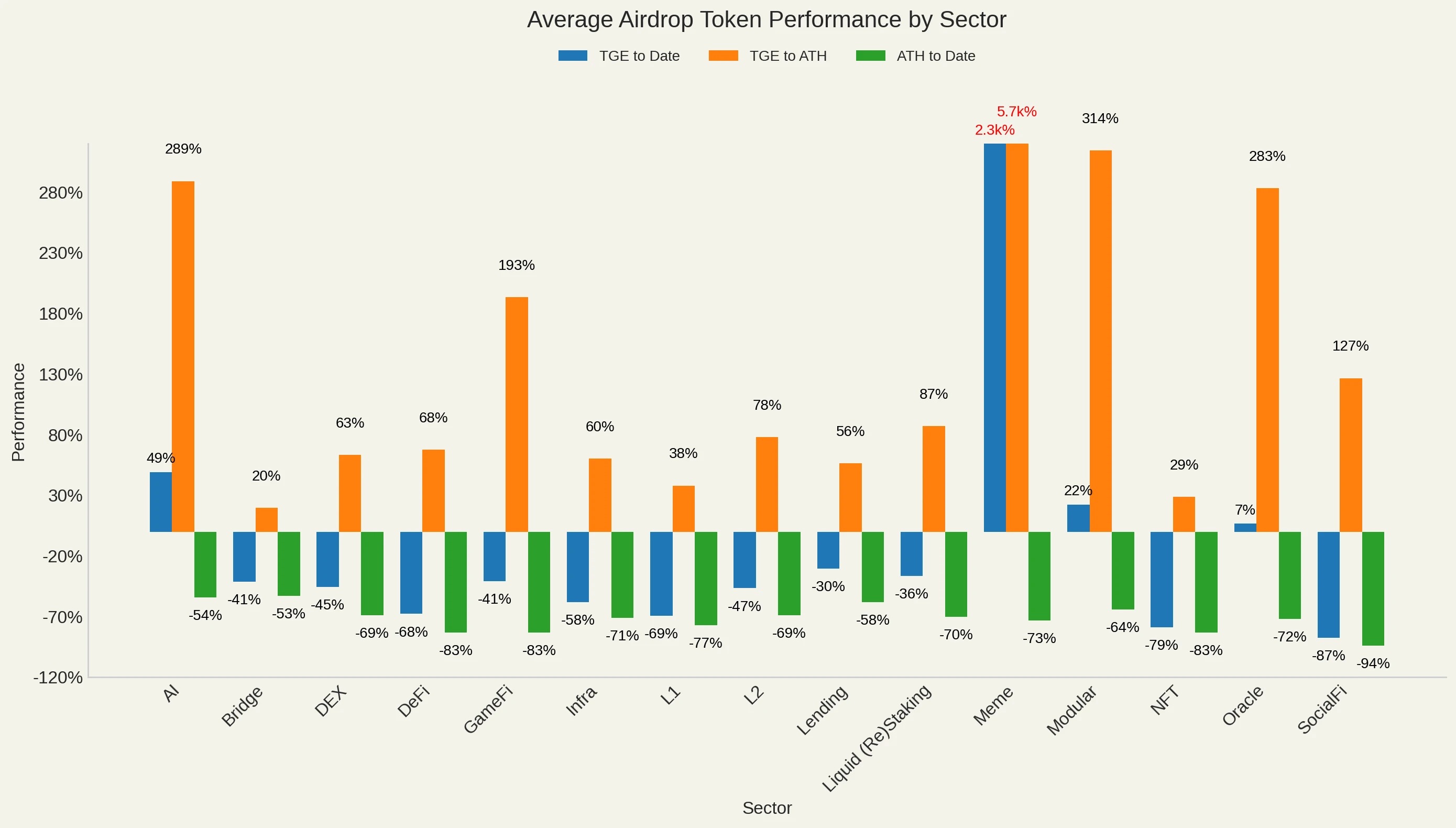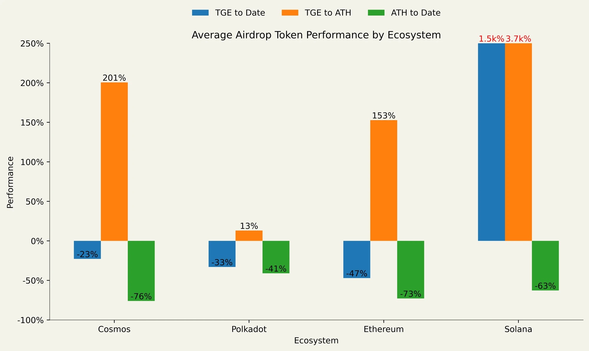 按生态系统分类的空投代币平均表现,从 TGE 到当前,TGE 到 ATH 以及从 ATH 到当前。离群值的条形被截断并用红色标注。