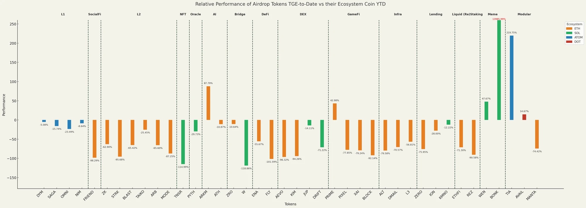 空投代币从 TGE 到当前相对于其生态系统代币年内表现的相对表现。离群值的条形被截断并用红色标注