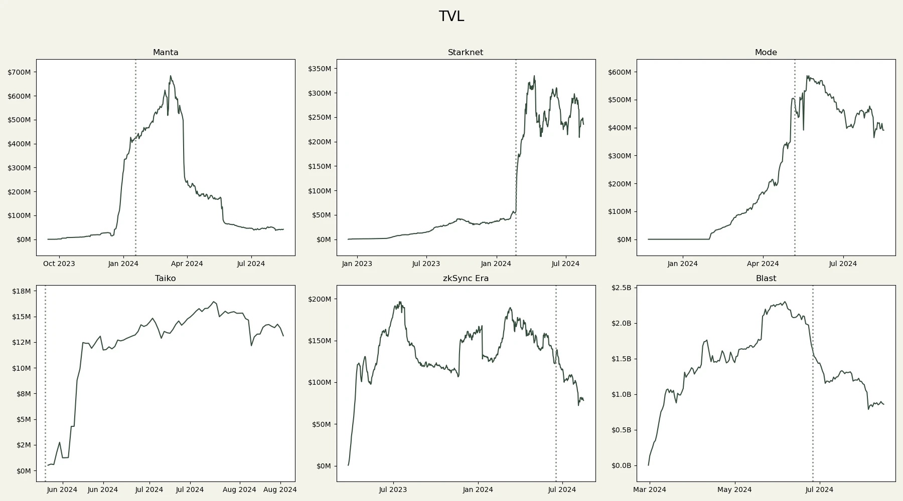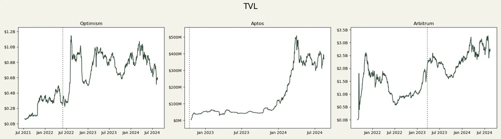 Taiko 选择在主网上线时进行 TGE,给人一种 TGE 对 TVL 有积极影响的假象,然而其 TVL 仅为 1400 万美元,表明市场对此兴趣不大。