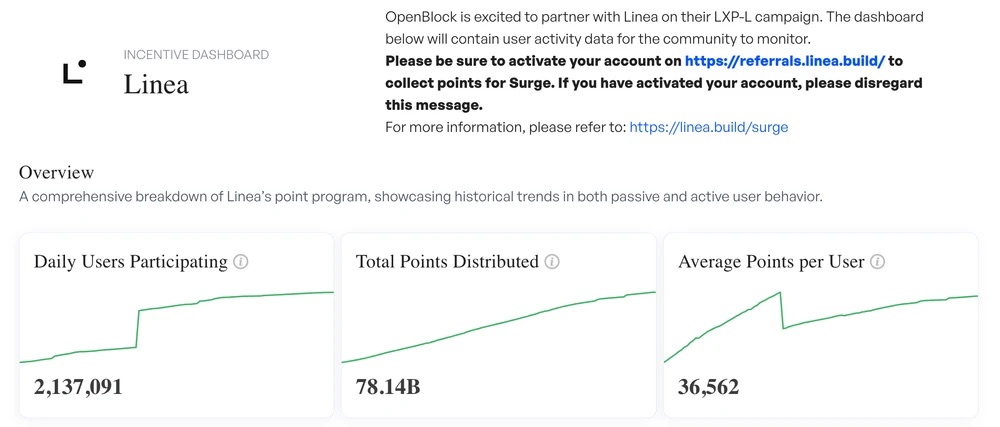 截至 2024 年 9 月 2 日的 OpenBlock Linea Surge Dashboard