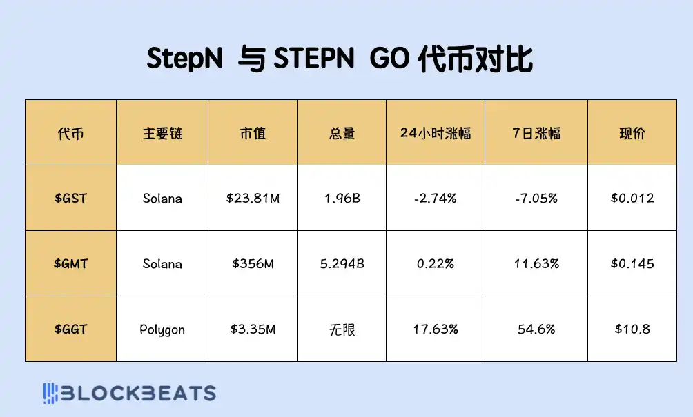 StepN 使用 GST 和 GMT 作为主要代币,而在 STEPN GO 中,新增了 GGT (Go Game Token),它被部署在 Polygon 链上,并且没有代币数量限制。