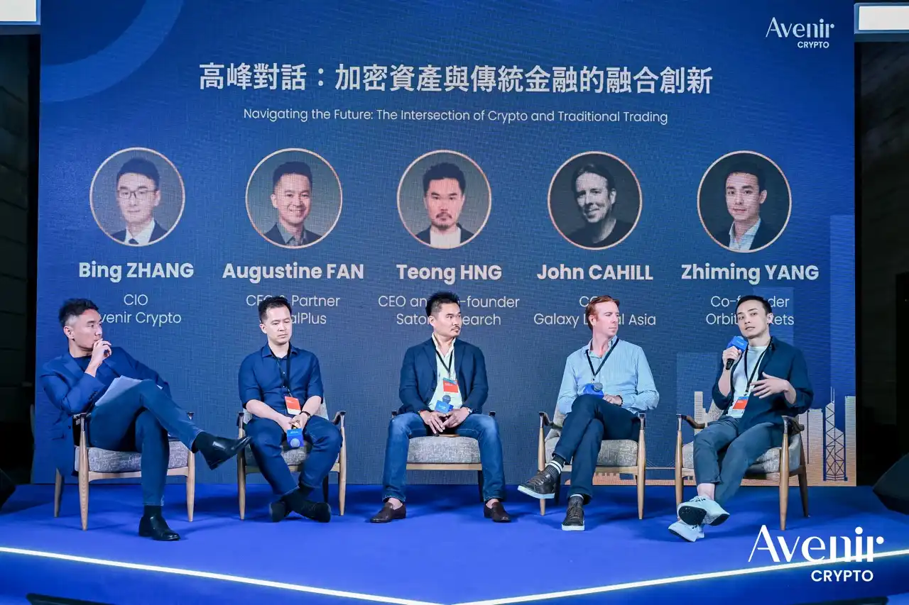 峰会的第二项议程是专题讨论,由 Avenir Crypto 的 CIO Bing ZHANG 主持,邀请了来自专注于衍生品交易的 SignalPlus CFO 兼合伙人 Augustine FAN、Satori Research 创始人兼 CEO Teong HNG、Galaxy Digital Asia 首席运营官 John CAHILL 和 Orbit Markets 联创 Zhiming YANG 四位重量级嘉宾,他们共同探讨了加密货币与传统交易的融合与未来发展路径,涵盖宏观经济、全球市场现状、投资策略、加密监管、交易基础设施等等。