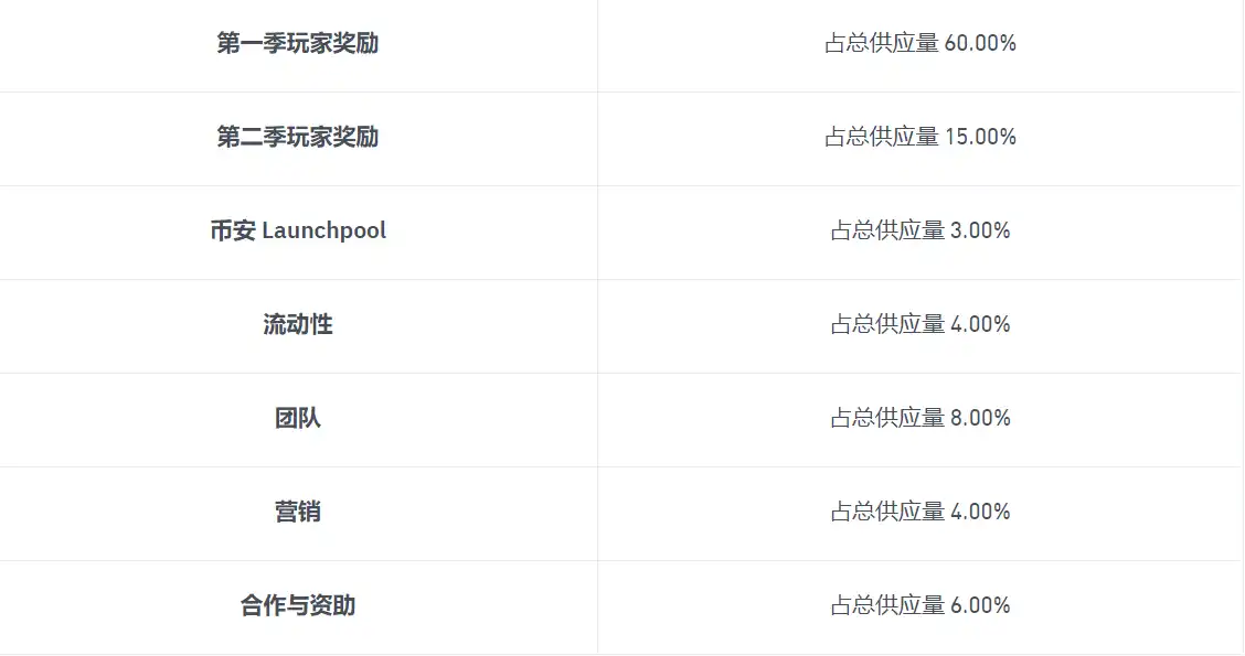 · 总供应量 60% 代币将用于第一季玩家奖励