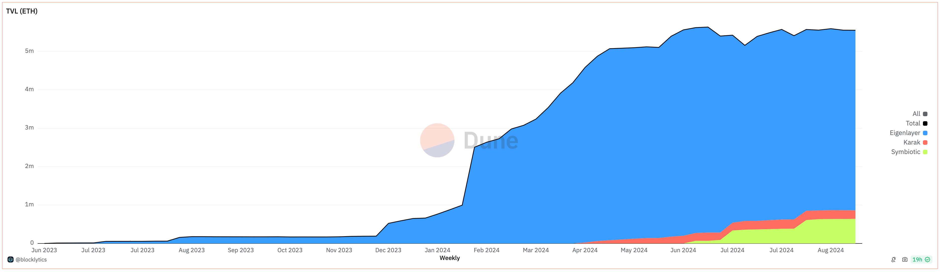 在 ETH 和以太坊生态的案例中,以太坊通过 EigenLayer 向未来的各 AVS 链「出售」网络安全性以换取 AVS 空投的方式来创造收益,并利用流动性质押和再质押两层产品叠加中间收益和玩法。这一套娃模式在年初市场上行期间表现不凡,也吸引了不少公链生态相继效仿,然而整条收益链路严重依赖 EigenLayer 的发展状况,这也是在 Eigen 后劲不足的情况下,以太坊再次陷入收益和场景危机的主要原因——再质押尚无法证明收益的可持续性。