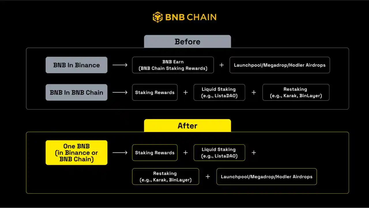 这意味着 BNB 过去的「共识割裂」正在逐渐弥合。过去,Binance 站内和 BNB Chain 链上的 BNB 通过不同的渠道和方式创造收益,服务两个不同的群体,BNB 生态流动性在这种收益结构下被隐性割裂,链上生态发展难以搭乘 Binance 的便车。