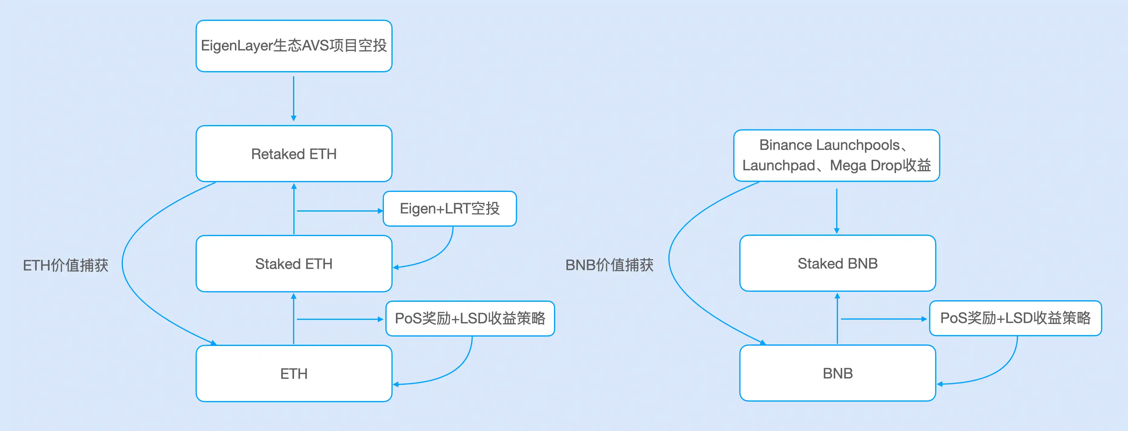 另一方面,从收益来源及结构的维度上看,向链上流动性质押代币共享 Launchpools 收益敞口的转变让 BNB 生态形成了独具自身风格的「BNB 特色主义再质押」。
