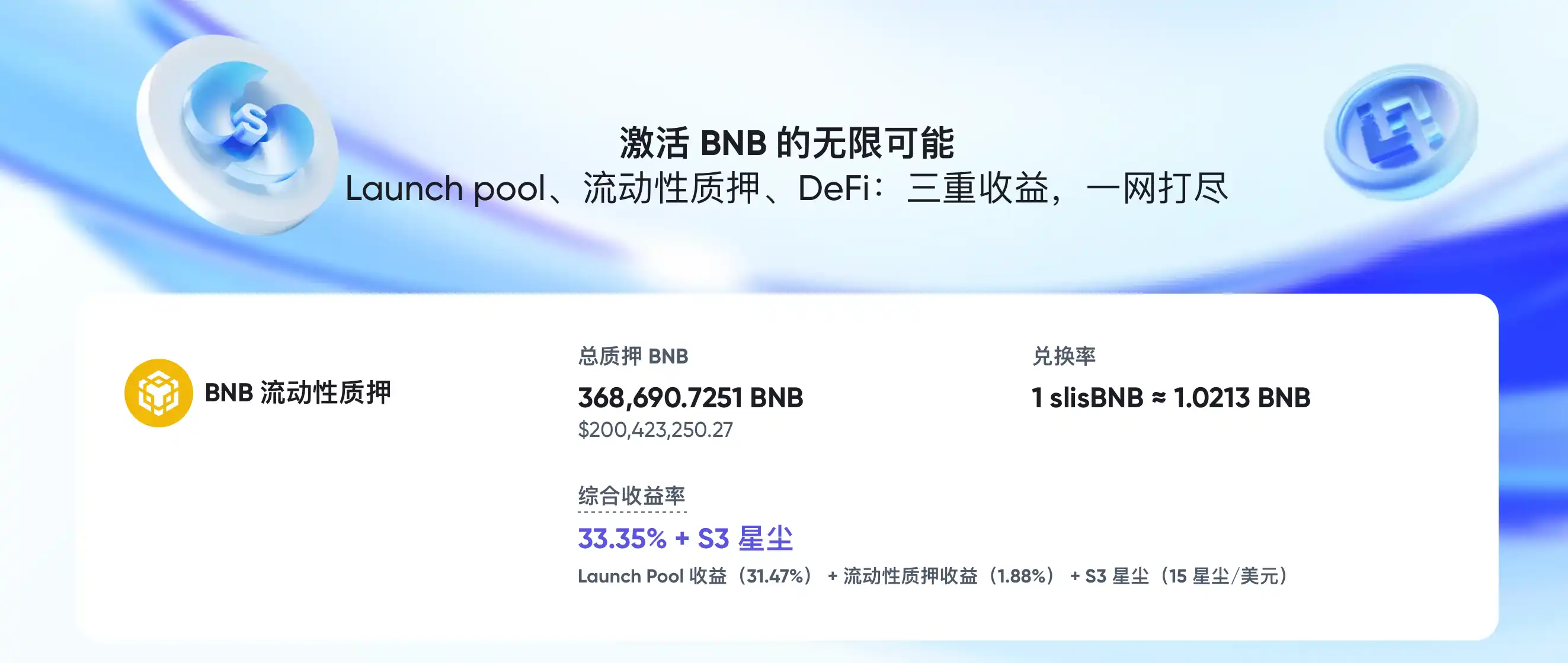 根据 ListaDAO 官网,slisBNB(ListaDAO 流动性质押代币)在综合 Binance Launchpool、BNB Chain 原生质押收益以及第三季星尘激励后的年化收益超过了 33%,其中超过九成是来源于 Launchpool 的收益累计。横向对比所有主流 L1 公链代币,原生流动性质押年化收益能超过 20% 的,如今仅有 BNB 一家。