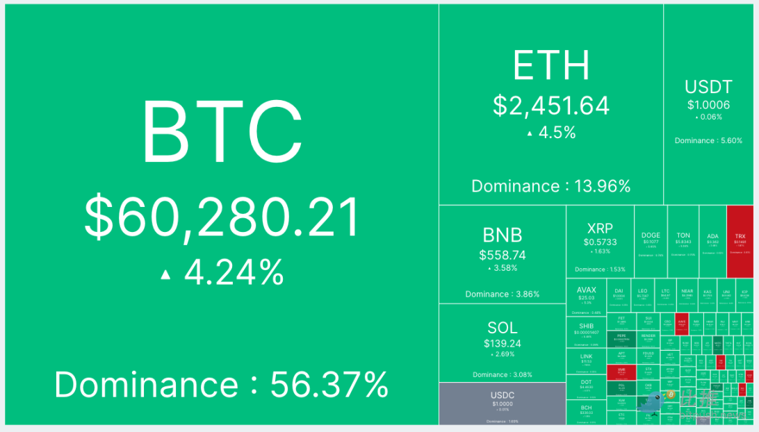 比推数据显示,当天早些时候,BTC 短线飙升逾 1,500 美元,从 58,000 美元跃升至 59,700 美元,在美股收盘后涨破 69,000 美元。截至发稿时,BTC 交易价格为 60,280 美元,24 小时涨幅 4.24%。