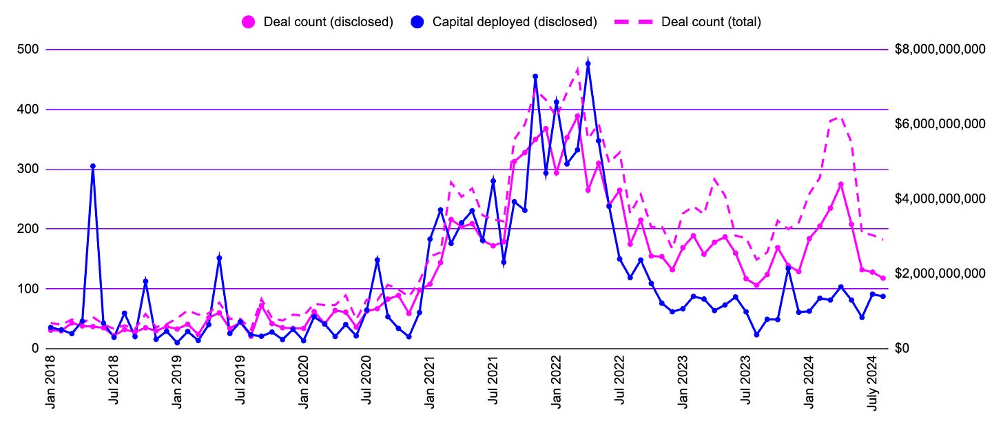 · 2024 年 8 月,共有 118 个项目(已披露)筹集了 14 亿美元,较上月下降 4%。