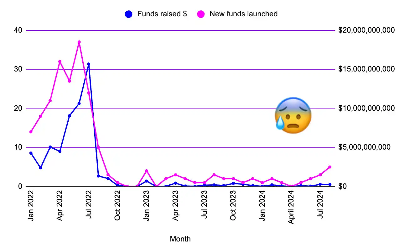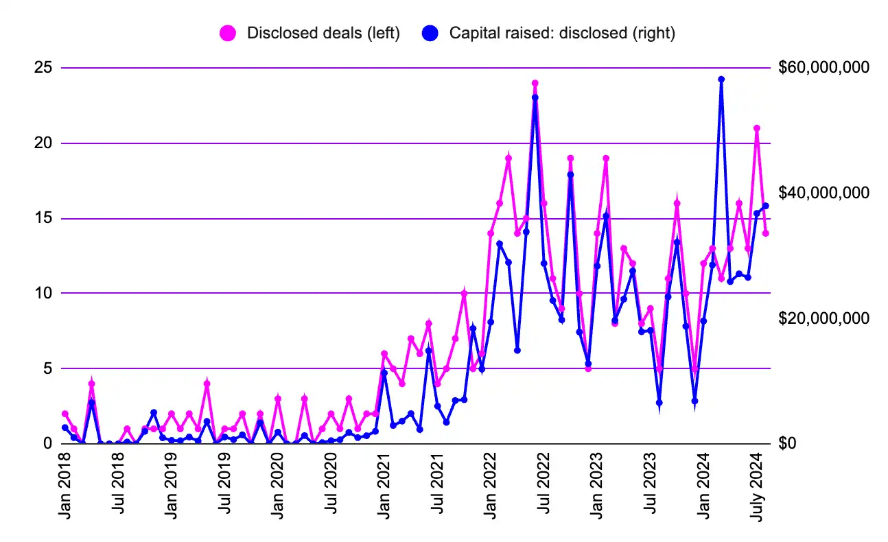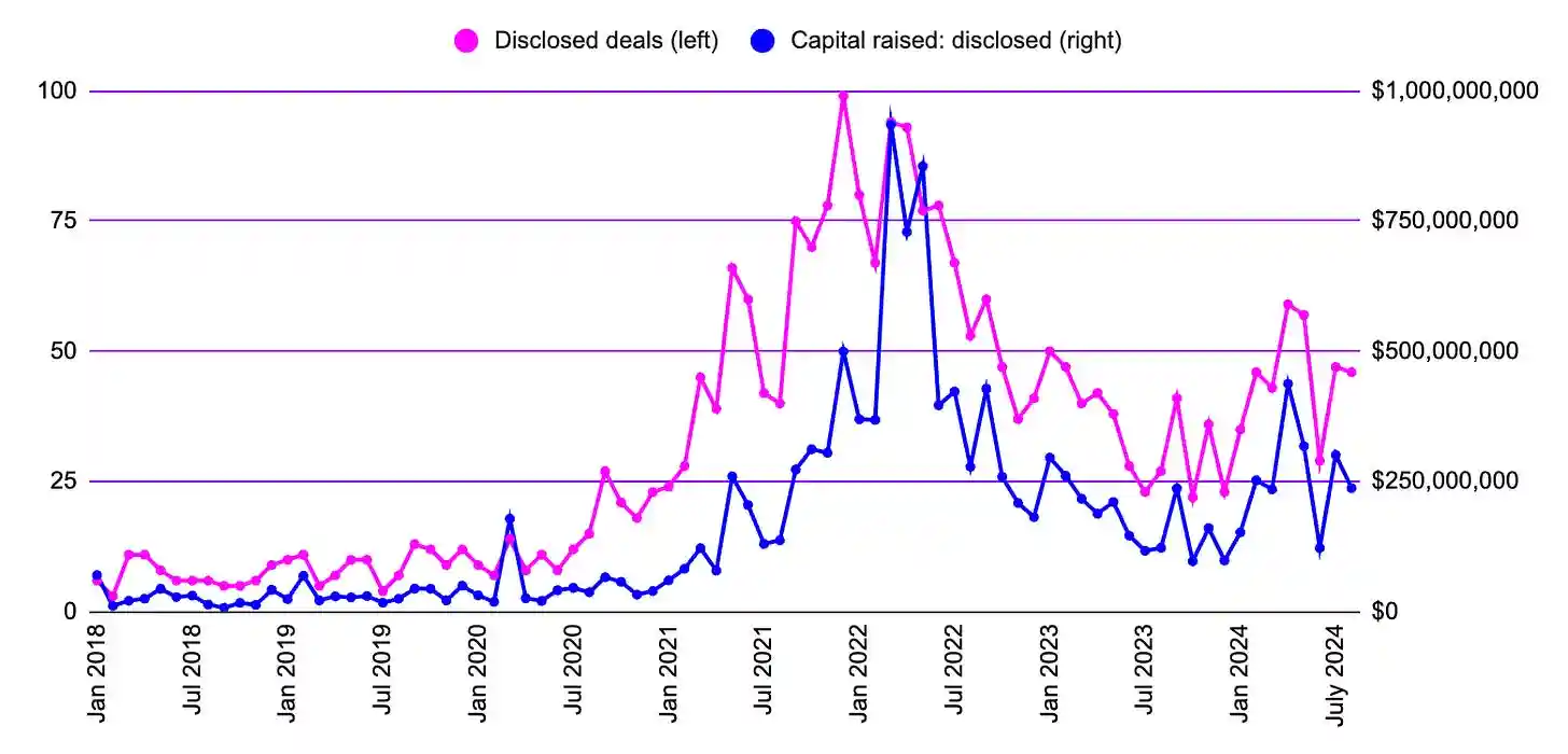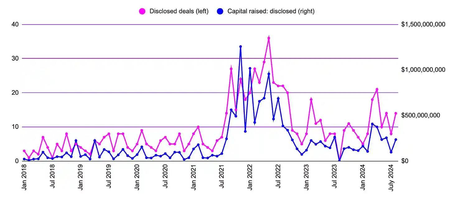 来源:Messari,2018 年 1 月至 2024 年 8 月的种子项目筹资情况