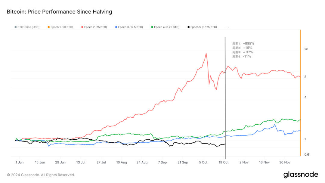 尽管在4月减半事件之前,市场首次突破了新的周期性历史高点,但这并未改变当前周期相对低迷的表现。