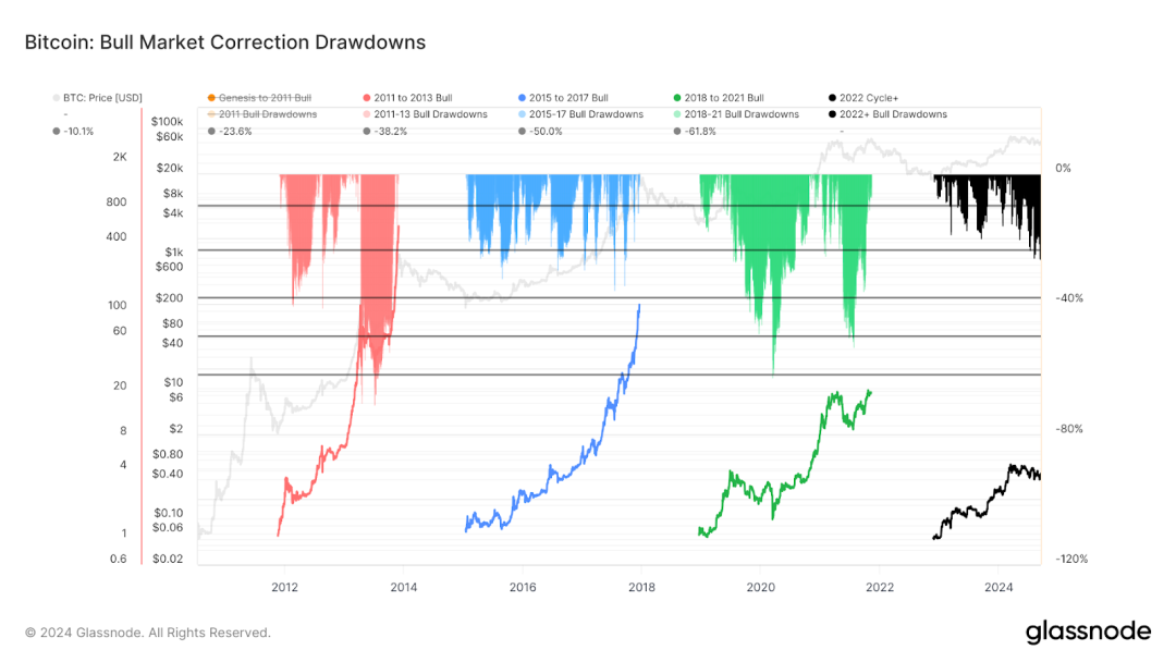 与历史周期相比,目前周期的价格回调幅度较小,市场结构相对稳健,比特币价格波动性减弱。