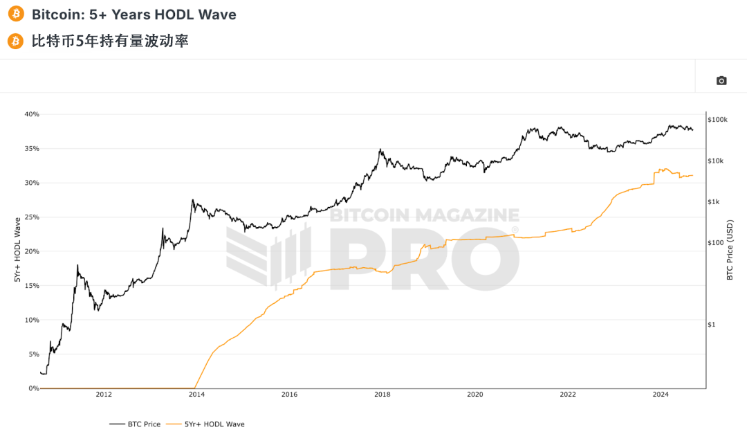 从图中可以看出,目前超过30%的比特币在过去五年内没有被转手,这一比例可能还会继续上升。