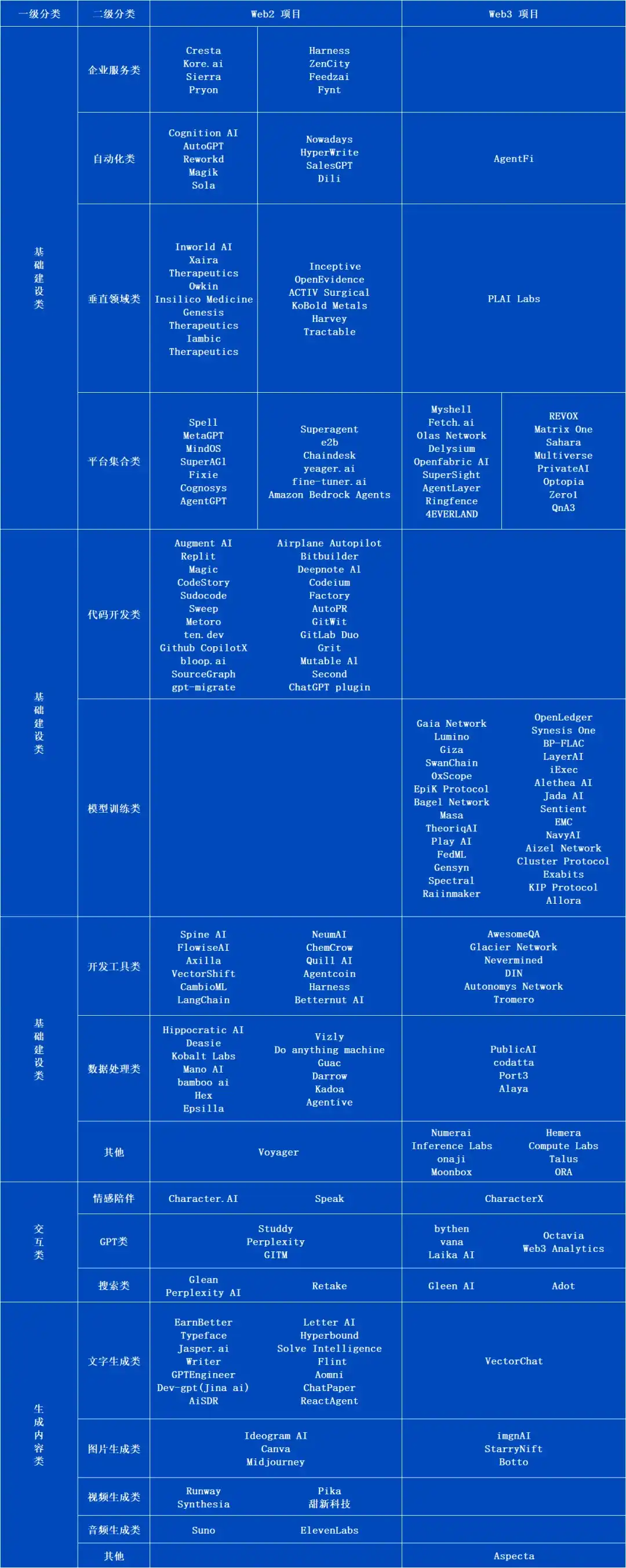 AI Agent 项目在 Web2 创业中热门、成熟的类型主要是企业端服务类,而在 Web3 领域中模型训练、平台集合类项目因其在构建生态系统中的关键作用而成为主流。
