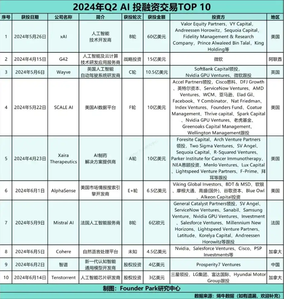 2024 Q2 AI 赛道融资 TOP10,来源:亿欧,https://www.iyiou.com/data/202407171072366